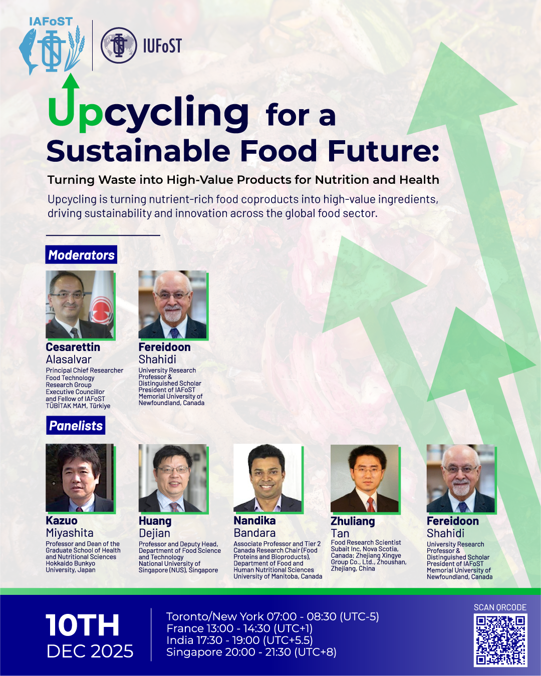 At the upcoming Scientific Roundtable, panelists from Canada, Japan, Singapore, and China will discuss global opportunities and challenges in advancing upcycling practices - from agricultural and food-processing coproducts to marine resources - highlighting how these approaches can drive sustainability and innovation across the food sector.